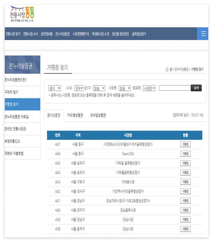 전국 대부분의 전통시장과 상점가가 가맹되어 있습니다. 매장 입구의 ‘디지털온누리상품권 결제 가능’ 스티커를 통해 쉽게 가맹점을 확인할 수 있습니다.